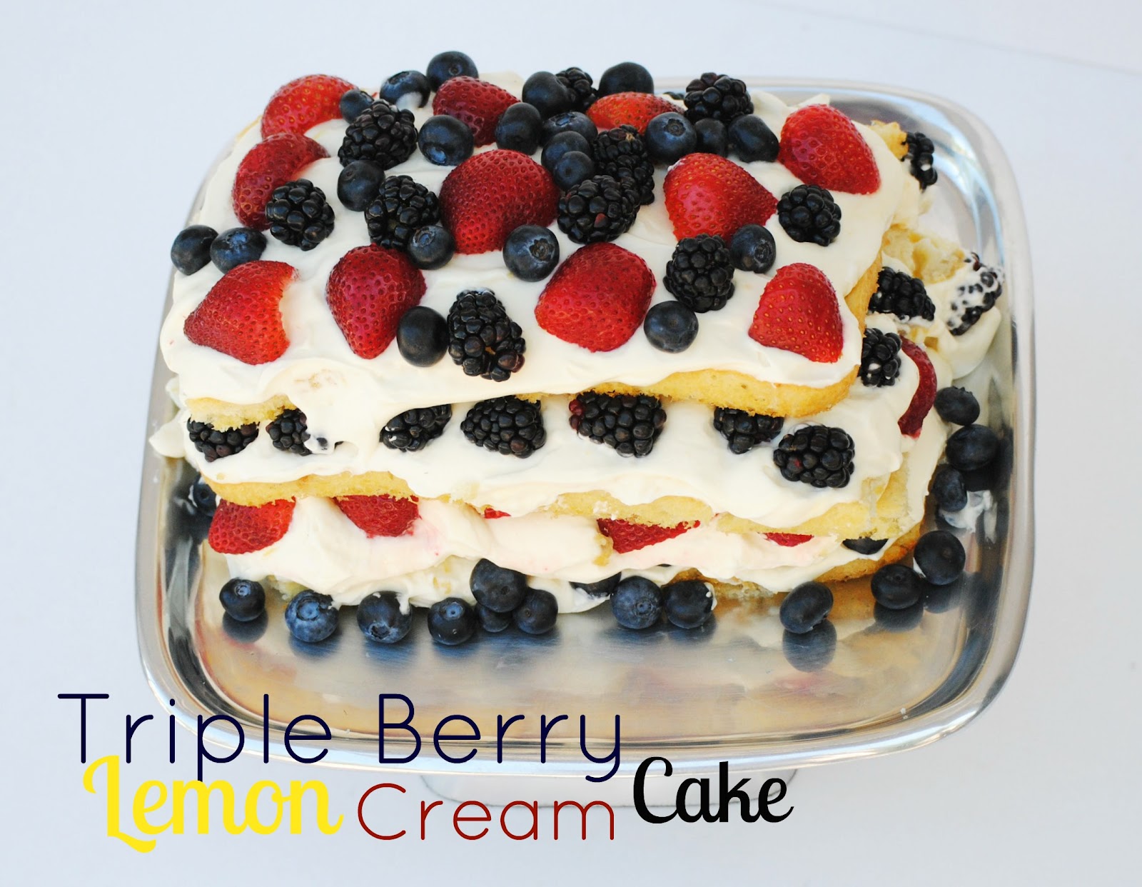 4. To assemble the cake, cut cooled cake into 4 small rectangular pieces, keeping it as even as possibe. Place one piece of cake onto serving platter. Top with one fourth of the cream. Top with 1 1/2 cups of one kind of berry. Top with another piece of cake. Top with more cream and another 1 1/2 cups of another berry. Top with another piece of cake. Top with more cream and 1 1/2 cups last kind of berry. Top with last piece of cake. Spread with remaining cream and any remaining berries. Refrigerate until ready to serve. Enjoy!